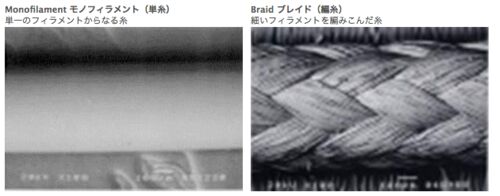 モノフィラメント 名前の通りmono(単)+filament(線)=単糸とも言う。 一本の線からなる糸であり表面が平らで細菌がつきにくい(感染が起こりにくい)。また表面がなめらかなために縫合の際に組織を傷つけにくい。ただし弾力が大きいために結びにくく、ほ…