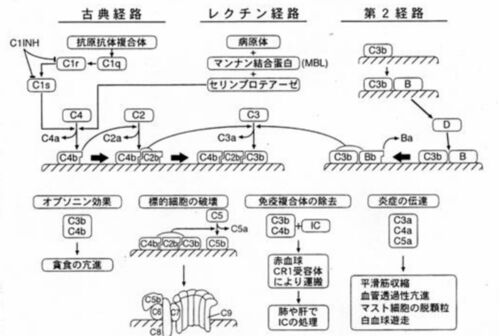 補体についておさらい 補体活性には大きく分けて3つの経路がある。古典経路、副経路、レクチン経路である。 古典経路:抗原抗体のきっかけで反応が開始 副経路:病原体にC3が結合することで開始 レクチン経路:MBL(マンナン結合タンパク)に病原体表面のマ…